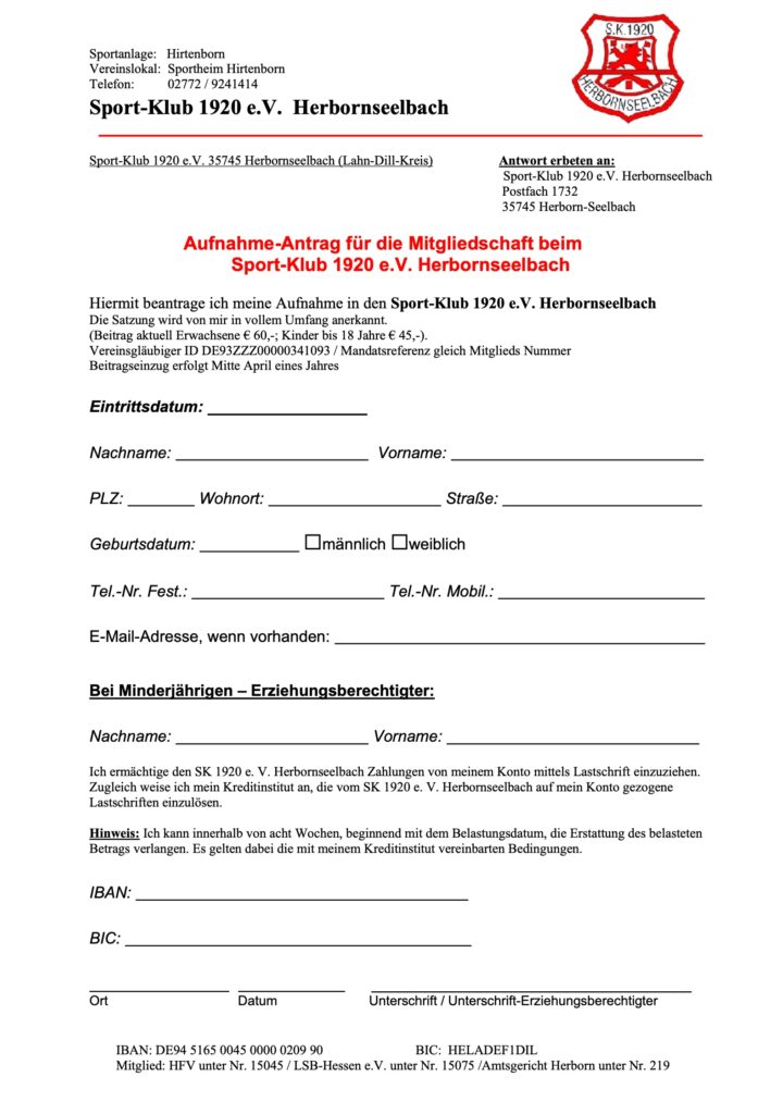 Wir freuen uns über jeden Neuzugang und heißen Dich Herzlich Willkommen beim SK 1920 Herbornseelbach! Möchtest du Mitglied bei uns werden, so lade dir einfach unseren „SKH Aufnahme Antrag“ herunter, fülle ihn aus und übergib ihn an ein Vorstandsmitglied.